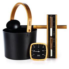Lyxpaket Narvi Svart/trä från Narvi är ett kvalitativt bastutillbehör utformat för att skapa en avslappnande och harmonisk bastuupplevelse.